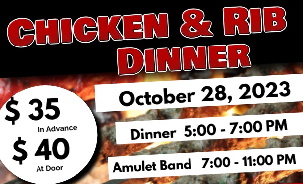 Join us for a Chicken & Rib Dinner on Saturday, October 28 then stay for live music entertainment from The Amulet Band. Dinner will be served from 5:00 PM – 7:00 PM and the band will play from 7:00 – 11:00 PM.