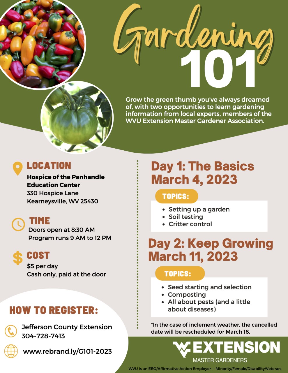 Gardening 101 is put on by the Berkeley-Jefferson Extension Master Gardeners and is open to anyone in our two counties.
