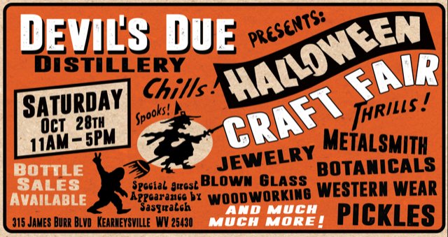 Devil’s Due Distillery is hosting an Indoor Arts & Craft Festival on October 28th from 11a to 5p & October 29th from 12 to 5p. We have hand chosen unique artisans to set up booths and offer our guests an array of different items. Come for a tasting and tour while browsing some of the best local crafters around.
