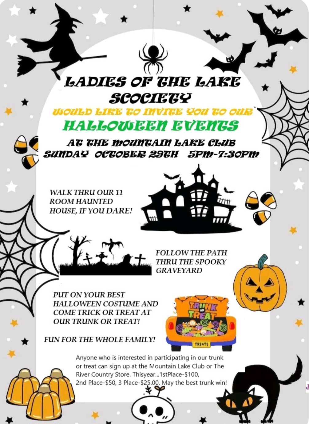 Join us at the Mountain Lake Club for all the Halloween Festivities. 11 Room Haunted House, Trunk or Treat, Spooky Paths thru the Graveyard and much. much more!