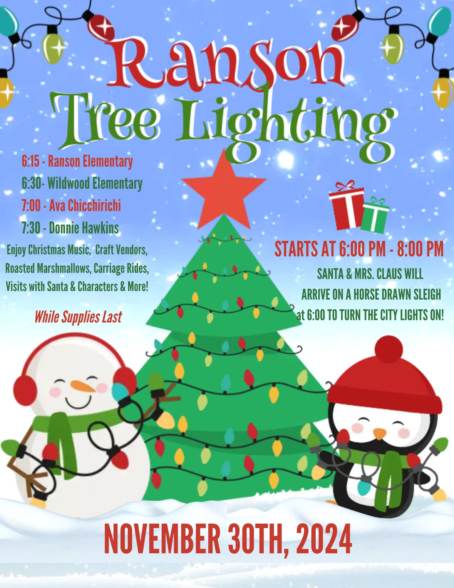 Join us for our Annual Tree Lighting on November 30th from 6:00 – 8:00. Visits with Santa, Horse drawn carriage rides, roasted marshmallows, hot chocolate, music & more!