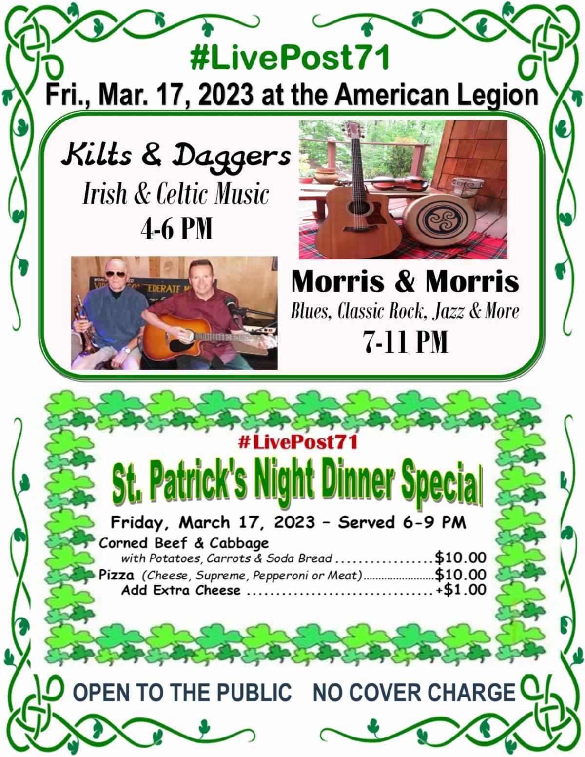 Are You Ready for a FUN TIME!!! This Friday is St. Patrick’s Day and the American Legion will have a full day of activities. Don your Best St. Patrick’s gear and participate in the LEPRECHAUN RUN/WALK starting at Two River Treads in Ranson and ending at our Post. Where you can enjoy the sounds of KILTS & DAGGERS (4-6 PM). We will be offering FREE Corned Beef & Cabbage tastings (small serving) from 2-6 PM. 6-9 PM we will have a Dinner Special of Corned Beef & Cabbage. Morris & Morris will keep the party going from 7-11 PM. We will be OPEN TO THE PUBLIC and SMOKE-FREE for the Day! COME JOIN US!
